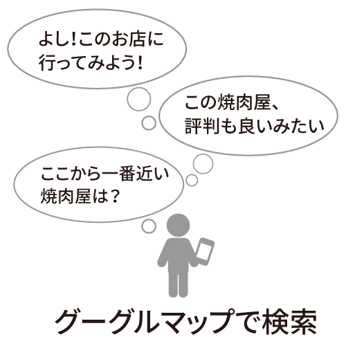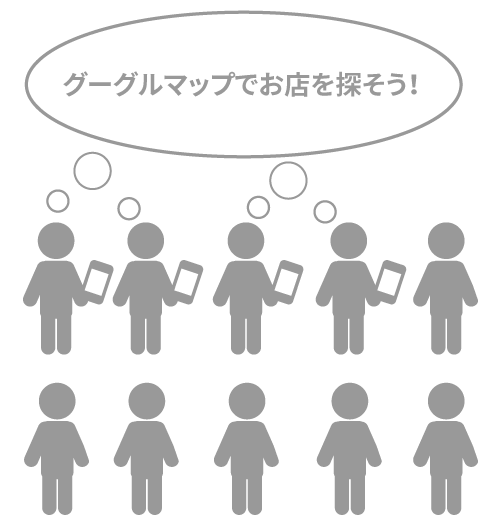 Googleマップ対策でなぜ集客できるのか?その最大の理由がこれです。Googleマップを使うユーザーの大半が、「今お店を探している人」です。つまり、例えば今日焼 き肉が食べたいと思った人に、自分の焼き肉屋をアピールできるのです。今焼き肉を食べたいと思っている人にアピールするのと、焼き肉を食べたいと思っていない人にアピールするのと…どちらが集客できるかは明白ですよね?これこそ、Googleマップで集客できる理由なのです。