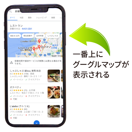 そして、その検索結果の一番上にあなたのお店が表示されていたとしたら、どうでしょうか?きっと、地域のお客さんをたくさん集客できると思いませんか?